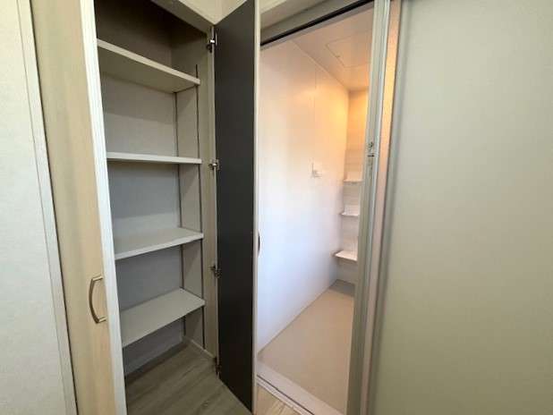 洗面ルームは タオルや洗剤などをしまう収納があります